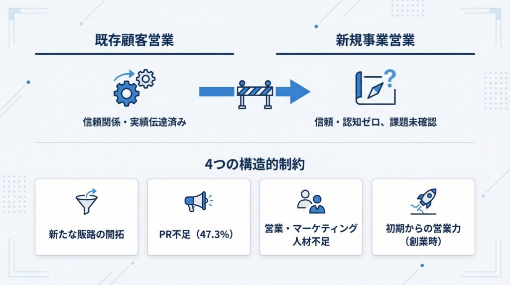 中小企業庁の調査によると、新規事業展開の課題として「新たな販路の開拓」を挙げた企業は51.6%、「PR不足」47.3%、「営業・マーケティング人材の不足」46.6%にのぼります(2023年)。この3つが上位に並ぶ事実は、新規事業の営業が単なる「営業力の問題」ではなく、構造的な制約の重なりによって難しくなっていることを示しています。
