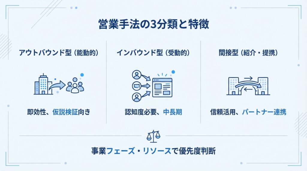 新規事業の営業手法は、「どのように顧客との接点を作るか」という観点から3つに分類できます。アウトバウンド型・インバウンド型・間接型です。それぞれ、接点の作り方だけでなく、成果が出るまでの時間軸やコスト構造も異なります。