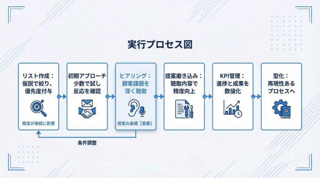 手法を選んだ後、実際にどう動くかが成果を左右します。新規事業の営業は、ターゲットリストの作成から始まり、初期アプローチ・ヒアリング・提案磨き込み・KPI管理・勝ちパターンの型化という6つのステップで進めることで、属人的な試行錯誤から再現性のある営業プロセスへ移行できます。