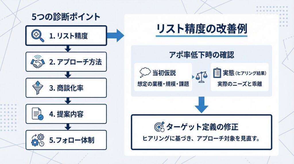 リスト精度・アプローチ方法・商談化率・提案内容・フォロー体制の5点を順に確認することで、どのステップに問題があるかを絞り込めます。