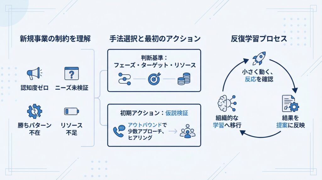 新規事業の営業が難しい理由は、認知度ゼロ・ニーズ未検証・勝ちパターン不在・リソース不足という4つの制約が重なっているからです。この構造を理解せずに既存事業の延長線上で動こうとすると、手法の選択も実行の優先順位も的外れになります。